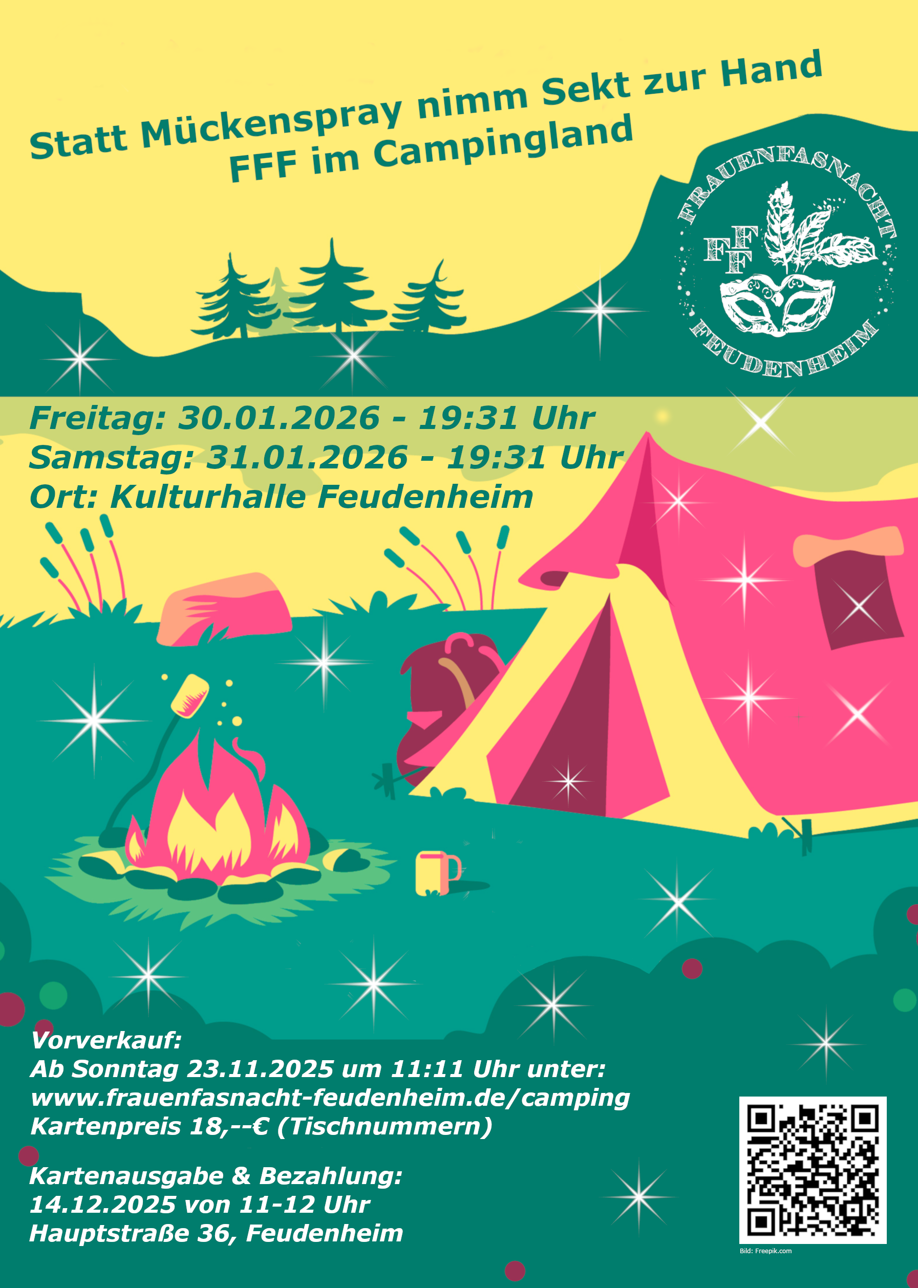 Ahoi,unter dem Motto "Statt Mückenspray nimm Sekt zur Hand - FFF im Campingland" freuen wir uns auf unsere Sitzungen im kommenden Jahr am 30 & 31.01.2026 in der Kulturhalle Feudenheim.